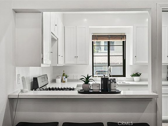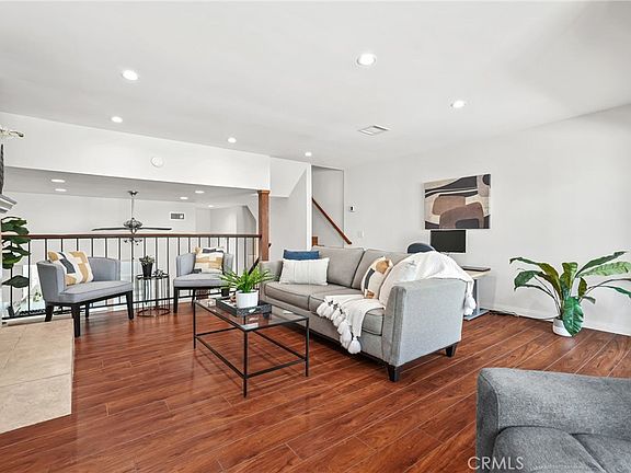 The light-filled living area boasts wood flooring and fresh paint. The roomy living room offers flexibility for multiple uses—perfect for lounging, working, or entertaining all at once. The dining area features soaring vaulted ceilings that create an airy, open atmosphere, while the updated modern kitchen showcases Quartz countertops, stainless steel appliances, and contemporary finishes. Step outside to enjoy your private balcony—ideal for morning coffee or evening relaxation.