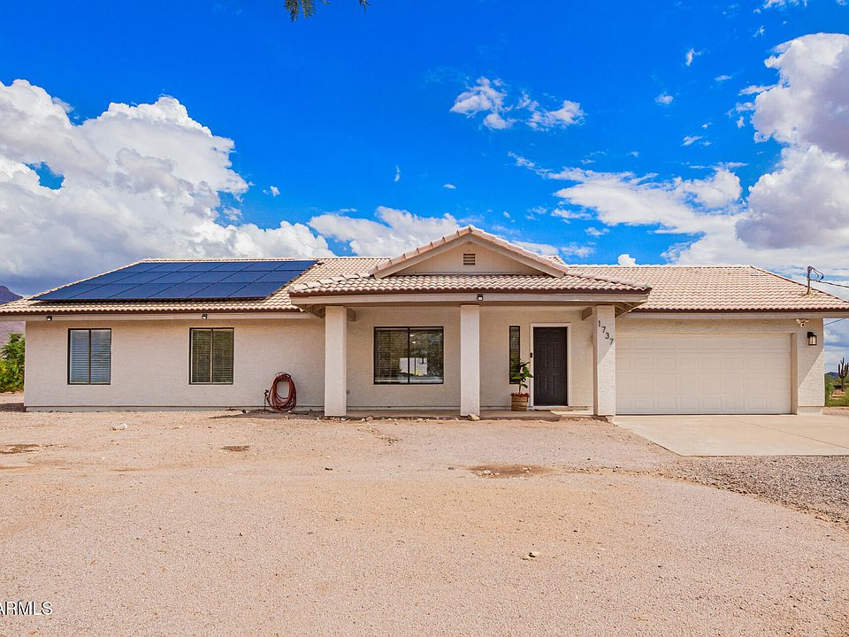 Breathtaking 4 bed/2 bath recently updated home on 1+ acre! Featuring high vaulted ceilings, corner lot positioning, no HOA, and amazing views of the Superstition Mountains. Enjoy carpet/pad, wood floors, a beautiful kitchen with cabinets, stainless steel appliances, updated faucets and lighting, quartz countertops throughout, and a kitchen island with breakfast bar. The master bathroom is completely updated with a custom tile shower, vanity with double sinks, quartz counters, and much more. 2-car extended garage with room for RV parking. provide plenty of space for family, guests, or even a home office. Step outside to your private backyard oasis, where you'll enjoy breathtaking views, stunning Arizona sunsets, and endless opportunities for entertaining. With plenty of space to relax, garden, or even add a pool, this yard is designed for outdoor living at its finest. Located in a quiet and friendly neighborhood, this home offers easy access to hiking trails, shopping, dining, and major highways, making it perfect for those seeking both convenience and tranquility. Don't miss your chance to own a beautiful home in one of Apache Junction's most scenic areas!