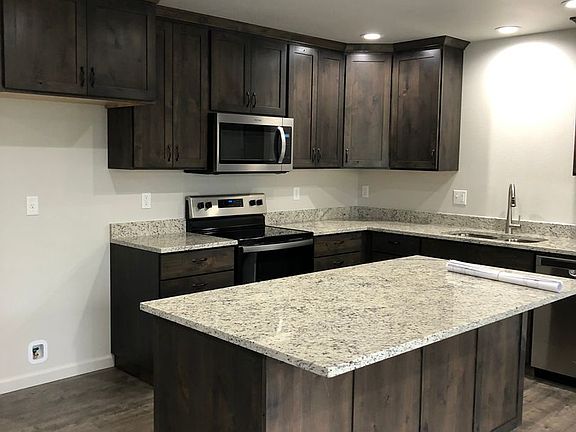 Beautiful islandNice countertopsCarpet in bedroomsStainless steel stove