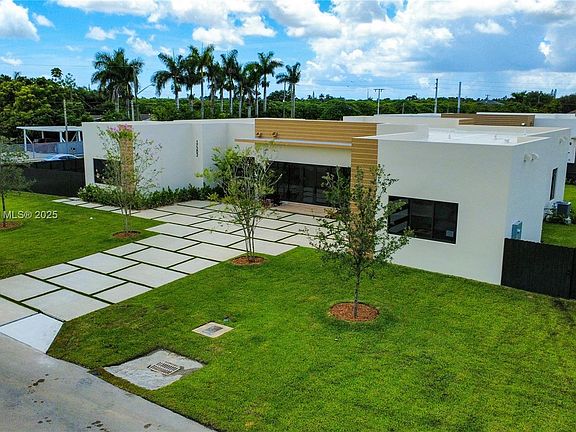 Modern CBS luxury new Construction home with flat TPO roof, hurricane-impact door/ windows, and in-law quarters. Spacious Lot with 17,025 sq ft modern sealed polished driveway with turf, double car garage, landscaped yard, sprinkler, and front /rear terrace/ porch. Inside, high 11' ceiling, porcelain flooring throughout the property, panel wood interior doors, recessed lighting, two tankless water heaters, two a/c units, and designed lamps. Chef's kitchen with modern wood cabinets to the ceiling, quartz counters with a waterfall island, stainless steel ceramic cooktop slide-in range, drawer microwave, hood, dishwasher, and energy-efficient smart refrigerator. Bathrooms with wood cabinets and quartz countertops. Main suite with a large walk-in closet. A/C laundry with washer/dryer.
