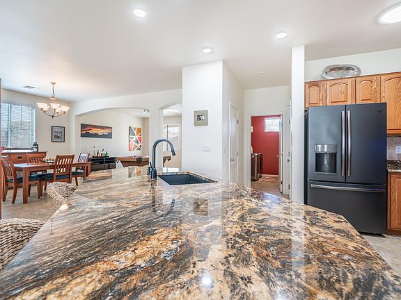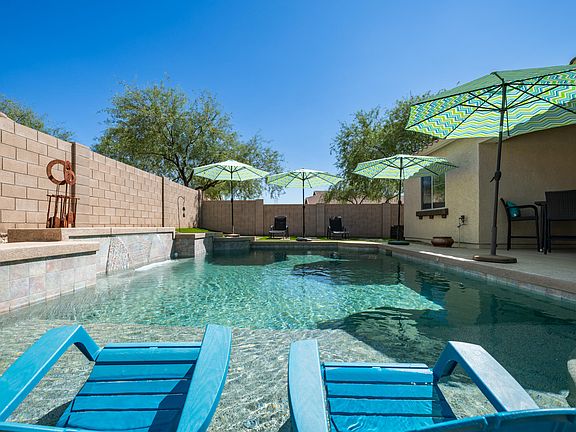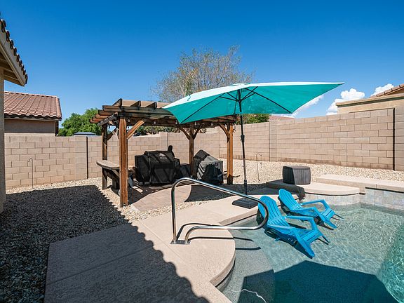 Meticulously cared for corner lot with pool, oversized tandem garage with built-in cabinets, and a desirable north-facing backyard! The open great room floorplan features a split primary suite, granite island kitchen with single basin sink, GE Profile stainless appliances in slate, large pantry, and RO plumbing. Neutral color palette, recessed lighting, skylights, and updated interior/exterior paint. All bedrooms include walk-in closets, and the primary suite offers a remodeled walk-in shower, dual vanity, and oversized closet. Resort-style backyard boasts a sparkling pool with in-floor cleaning system and water feature, large Baja deck, pergola, cool deck, artificial grass, and a charming front porch. Conveniently located near Loop 303, hiking and biking trails, and excellent schools.