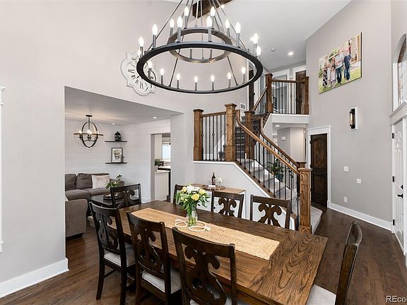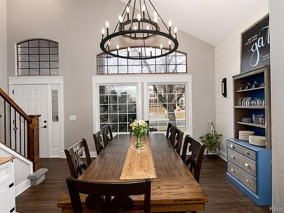 Highlands Ranch Home on a Spacious Corner Lot in a Cul-de-Sac! Northridge community, this beautifully updated home sits on an oversized lot, offering garden beds, ample space for outdoor activities, and even a private basketball court. Charming curb appeal, arched entryways, and thoughtful window placement. Step through the front door into a grand two-story foyer, where a wide curved staircase has been elegantly updated with maple-stained wood railings, custom iron banisters, & modern finishes. The adjacent dining room sets the perfect mood for entertaining, featuring dramatic lighting, wood floors, and stylish wide-plank paneled walls. The remodeled kitchen is truly the heart of the home, boasting quartz countertops, custom cabinetry, a large center island with an eat-up bar, stainless steel appliances, pendant lighting, and a designer tile backsplash—a dream space for cooking and gathering. Just off the kitchen, the family room offers warm wood flooring, a custom tile-surround fireplace with a wood mantel, and large windows that fill the space with natural light. A cozy living room off the kitchen provides a serene view of the covered patio and expansive backyard. Upstairs, the primary suite is a retreat of its own, featuring vaulted ceilings, neutral-toned carpet, and a private 400 sq. ft. Trex deck, where you can sip your morning coffee while taking in the mountain views & stunning sunrises. The en-suite five-piece bath includes a skylight, dual sinks, a tile-surround shower, and elegant finishes. Three additional bedrooms, along with a full bath featuring double sinks and custom tilework, complete the upper level. The finished basement adds versatility, currently used as a bedroom but easily adaptable as an office, media room, or workout space, with a 3/4 bath and abundant natural light. Outside, the expansive backyard is perfect for entertaining, featuring a covered patio ideal for summer BBQs, relaxing evenings, and quality time with family & friends.