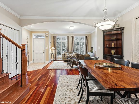 Beautiful single family home located on a quiet one-way street in West Bucktown with the 606 Trail only half a block away. This home offers 4 bedrooms, 3 and a half bathrooms, an ideal open floor plan, hardwood cherry floors throughout the main and top floor levels, skylight features on the top floor and multiple outdoor spaces to enjoy. The living room welcomes you into this home with hardwood floors, crown molding features and east facing windows. An arched doorway connects the living room with the dining room. The spacious kitchen has a large island with a raised bar for casual dining, granite countertops, cherry cabinets, stainless steel KitchenAid appliances and a built-in dry bar area. A matching archway connects the kitchen to the welcoming family room with a wood-burning fireplace, and opens up to the large back deck. And just up the stairs from the back deck is the spacious garage rooftop deck with a seasonal gazebo that makes for a perfect place to enjoy the summer and the beautiful ornamental pear tree in the backyard. Both the front and backyard have been thoughtfully landscaped. The top floor primary suite that is located in the back of the home, offers vaulted ceilings, a gas fireplace, a private balcony and two large closets. The spa-like ensuite primary bathroom includes a large granite double bowl vanity, soaking tub, spacious separate shower with rain and body jets. Two additional sizable bedrooms are upstairs. The front facing bedroom features a vaulted ceiling and three large windows in an oversized 17ft x 13ft room, and the middle third bedroom upstairs has ample closet space. The laundry is conveniently located upstairs as well as an additional hallway bathroom. The large light-filled lower level rec room features an upgraded wet bar and beverage fridge, perfect for entertaining. There is also a 4th bedroom and an extra oversized 16ft x 10ft storage room with utility sink. This storage room can easily be converted into a mudroom or 5th bedroom; and features laundry hookups if one wants to move the laundry from the second floor to the basement. Two car garage included. Short trip to the CTA Blue Line (0.3 mile), and numerous shopping and restaurants in the immediate area.