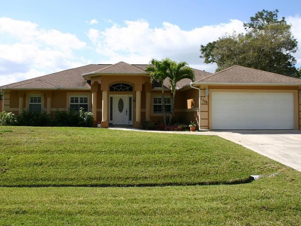 Welcome to this beautiful concrete block home built by Town & Country, a well-regarded builder. With just over 2,000 sq-ft of living space the home offers 3 bedrooms and a private den with french doors. The floor plan is usably functional with an even flow that allows for privacy. The home has neutral colors and handsome plantation shutters. The owners have outfitted the property to be fully wheelchair accessible. Walking in to the formal entry you'll be greeted by two columns that announce the formal dining room. Continue in to the spacious living area that is open to the kitchen and breakfast nook. Who doesn't love the open concept when it's portrayed so well in this floorplan? The kitchen has light corian counters, stainless appliances, real wood cabinets, and a large pantry. Easily entertain with the passthrough to the dining room or grab the groceries from the car in the garage just off the kitchen. Enjoy the splashing waterfall from the pool as you sip your morning coffee in the breakfast area or out on the covered patio. This pool is screened and heated which means you can enjoy it all year long! Fido can escape through the doggie door in to the partially fenced yard. A drainage canal in back affords freedom from neighbors' proximity. The yard is on automatic irrigation from a well. In the master suite you'll find a spacious bedroom that can hold lots of furniture! Down the hallway to the master bath are two separate closets. In the bathroom is a stand-up shower, soaking tub, and two separate sinks. The shower and one of the sink stations are wheelchair accessible. The split floor plan makes this house great for families or overnight guests. Escape to the den and close the french doors to use as an office or additional entertainment room. The guest bedrooms share a cabana bath that exits to the pool. You'll find ample closet space in the 2nd and 3rd bedrooms and there's even a linen closet in the hallway. The laundry room has a slop sink and is large enough for extra storage shelves. The additional refrigerator in the garage stays with the property. Linen closets in both bathrooms. Kitchen lighting is on a dimmer. Owner would consider selling furnished. The property is wheelchair accessible in that all doorways in to the house have concrete ramps. A concrete apron was made as an extension off the doorway in the garage around to the driveway to provide an exit from the garage in case of emergency. The doorways are wide and the tile is consistent throughout. This home boasts an ideal location just off Crosstown Parkway. Take your pooch for a walk with easy and quick access on the loooong sidewalks of Crosstown. You're less than 2 miles from the new Publix near Verano. Tradition in less than a 10 minute drive for the restaurants, shops, and community events. Take California Blvd in to St Lucie West and you have even more entertainment options at the movies, Mets spring training, bowling, and so much more!