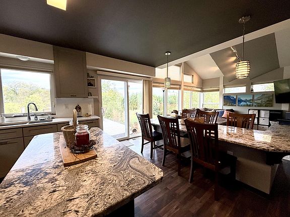 Close to everything but far from ordinary! Just minutes from downtown Hartford, this custom home features a wall of windows with serene pond views. Open-concept main floor includes vaulted ceilings, laminate flooring, and a built-in dining table. Spacious kitchen with custom cabinetry is perfect for entertaining. Wind down in your first-floor primary suite with a huge walk-in closet. Upstairs offers two more generous bedrooms and a full bath. The finished lower level adds a 4th bedroom, full bath, and wet bar -- ideal for guests, hobbies, or movie nights. Enjoy sunsets from your oversized deck overlooking a park-like yard! Book a showing today, this one won't last long!