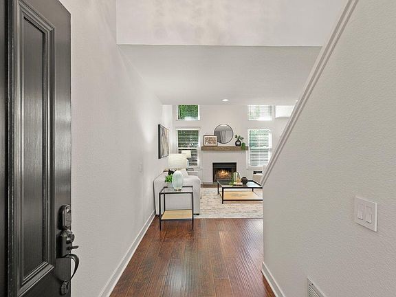 Nestled in the heart of Morgan Hill, only a mile from Downtown. Showcasing stunning features, beautiful landscaping with community pool. The spacious living room features soaring ceilings, abundant natural light from multiple windows, and a cozy modern fireplace as the centerpiece. The open-concept layout flows seamlessly into the dining area, featuring elegant black lighting fixtures, and a stylish kitchen with a breakfast bar. The sliding door off the kitchen leads to a private patio. The laundry room with additional cabinet space and easy access to the attached garage. A generously sized half bath downstairs offers added convenience. Upstairs, new luxury plush carpeting enhances the spacious loft area and three well-proportioned bedrooms. The elegant primary suite includes a private fully permitted upgraded balcony, updated bathroom with dual sinks, and a sleek walk-in shower. The two additional bedrooms share a modern bathroom with a shower over an oversized tub. Enjoy a private retreat with low maintenance in your backyard, perfect for pets or play. Framed by lush trees and peaceful views. This home is ideally located near multiple parks, schools, shopping, and all that the community has to offer, blending small-town charm with easy access to Silicon Valley.
