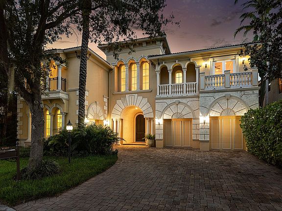 You are going to fall in love with this stunning courtyard estate boasting 8,360 total sq ft, and almost 6,400 sq ft living! This 5 bedroom, 5.5 bath, 3 car garage home is nestled in the highly sought after community of Azura in Boca Raton. The exterior of this home shines as the property's landscaping has been professionally done with tropical plantings. You also have luxury outdoor lighting, a beautiful free form pool with an elevated hot tub, and a stunning veranda with a wood plank ceiling for shade and comfort. The outdoor space truly encompasses Florida living at its finest. As you enter the custom oak front door, your jaw will drop! You will walk into the grand foyer with soaring ceilings overlooking the pool. The downstairs is perfectly designed as you have a large living room with tons of natural light, a huge game room / 5th bedroom with a coffered ceiling, a massive open chef's kitchen with a 6 burner Wolf gas range with dual ovens, GE Monogram refrigerator, Miele dishwasher, tons of storage, walk in pantry, butlers pantry, a beautiful long island, all overlooking the family room. As you go up the wrought iron staircase with solid marble steps you will be greeted with a split upstairs floorplan. The upstairs features 3 large guest bedrooms with on-suite bathrooms and custom walk-in closets and the Primary. The guest bedrooms are split from the primary for privacy. The primary bedroom is very large and overlooks the pool / courtyard. The primary bedroom encompasses an office space, his and her bathrooms with shower jets, Kohler fixtures, marble countertops, glass showers, two large closets, and a balcony! All the bedrooms upstairs are finished with hardwood flooring. To complement the bedrooms upstairs, you also have a loft and a generously appointed laundry room!