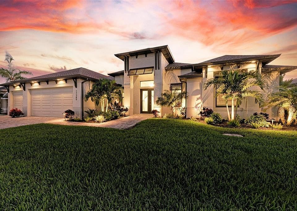 LUXURY FOUND in this GORGEOUS 2020 Built 3 Bedroom, 3 Bathroom + Den, 3 Car Garage WATERFRONT CUSTOM POOL HOME with PRIVATE LONG WATER VIEWS and DEEP CANAL ACCESS to Charlotte Harbor and the Gulf of Mexico. Enjoy beautiful curb appeal as you take in the NEW ROOF, upgraded landscaping, oversized driveway, and the on-trend exterior of this modern coastal home. Inside the custom glass front doors, you will be captivated by the long water views and open/airy interior of this open concept floor plan. Find 12' ceilings with boxed coffers or tray ceilings and custom trim/crown molding throughout and enjoy the 10' sliding glass doors that open to the lanai to bring those stunning sunset views inside. The gourmet kitchen is open and connected to the massive living room, with a large island, a separate bar area with extra cabinetry including lighted glass front upper cabinets, under cabinet lighting, and extra storage. Off the back side of the kitchen is a spacious pantry and mud room that connects to the oversized 3 car garage with epoxy floor, generator plug connection, sink, extra storage, and upgraded lighting. On the other side of the kitchen, find a large dining room with sliding glass doors to the summer kitchen/oudoor bar area with additional seating. On the left side of the home, two guest bedrooms with large walk-in closets await, with one guest bathroom in the hallway area for convenience and a second guest bathroom en-suite to the 3rd bedroom, with direct pool access, as well. Off the other side of the great room, find a large office/den/flex space, and a large primary suite with sliding door access to the lanai/pool/spa, with a stunning en-suite bathroom with large shower, spacious walk-in closet with custom cabinetry, and connection to the centrally located laundry room with extra cabinetry and storage. Outside on the lanai, find yourself captivated by the oversized heated saltwater pool with sun shelf and HUGE circular spa with waterfall tile. With separate seating areas under cover, that also have additional protection from storms with Kevlar roll down hurricane shutters, this extended space is ideal! Farther outside the lanai, the paver walkway connects to the new large 30' dock with Trex surface, covered boat lift with lighting, and great guest dockage. This home has it all, with extra sidewalks around the side of the home to the driveway, a well for irrigation/landscape, upgraded plantings, 90' of waterfrontage with a beautiful SOUTHWESTERN EXPOSURE, and has transferrable flood insurance currently only $1187/year! Nearby to great shopping, restaurants, beaches, parks, golf, and more, this home is ideal for enjoying your imagined SWFL lifestyle, so schedule your showing today! Furniture and boat can be made available separately! BE SURE TO CLICK THE FULL VIRTUAL TOUR LINKS FOR DETAILS