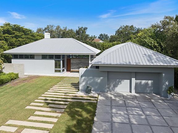 Nestled along Cherokee Drive in the prestigious Cherokee Park neighborhood, this residence enjoys a premier setting on one of Sarasota’s most sought-after streets, renowned for its graceful oak canopy and classic west-of-the-trail charm. This residence embodies the perfect balance of modern architecture, natural materials, and tranquil privacy. Designed by award-winning architect Guy Peterson and constructed by master builder Pat Ball, the home delivers a rare combination of architectural pedigree and enduring craftsmanship. Positioned on a gracious, estate-sized parcel surrounded by lush greenery, the home’s U-shaped floor plan wraps around its showpiece, a 45-foot crystal-clear pool with integrated spa, creating a seamless indoor–outdoor living experience that defines the Sarasota lifestyle. Outside, the stone pathway leading to the custom mahogany front door sets a striking geometric tone. Inside, board-on-board architectural molded concrete accent walls, Santos Mahogany wood floors, and cypress-accent ceilings strike a natural harmony with the home’s sleek, modern lines. Floor-to-ceiling impact-rated Marvin windows flood the interior with light, framing tranquil views of the pool and landscape from nearly every room. The wide-open living and dining area, anchored by a wood-burning fireplace, sets the tone for elegant yet effortless entertaining. The chef’s kitchen features Wolf and Sub-Zero appliances, extensive custom maple cabinetry, and a seamless connection to both indoor and outdoor dining spaces. In the west wing, the expansive primary suite serves as a private retreat with walls of glass overlooking the grounds, complemented by an adjacent executive office for work-from-home convenience. The east wing hosts two en-suite guest bedrooms, each with sliding glass doors opening directly to the pool. A detached guest cabana offers a complete living area, kitchenette, and en-suite bedroom that is ideal for visitors, extended stays, or use as a private art studio or executive home office. Located within Cherokee Park, one of Sarasota’s most established and beloved neighborhoods, this home offers walking distance to Southside Elementary, minutes to Southside Village and downtown Sarasota, and easy access to Siesta Key Beach, just five streets away. The community is known for its family-friendly gatherings, tree-lined streets, and timeless Sarasota character.