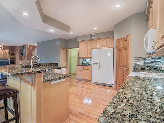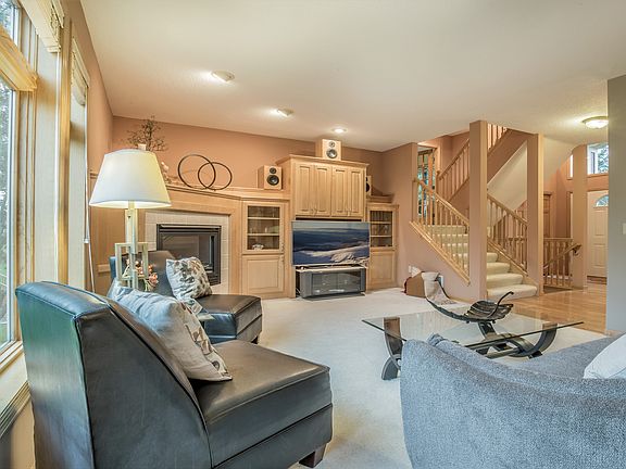This home offers grand curb appeal and spacious open floor-plan. Formal dining room features attractive double recessing ceiling. Living room with corner gas fireplace, custom built-in storage and wall of windows for abundant natural light. Kitchen with large tiered island allows for 6 bars stools! Walk-in pantry. Wood floors. 2 Flex rooms makes for great office, library, craft/toy/gaming/exercise room. Huge master suite with fireplace, lounge area and walk-in closet. Finished lower level walk-out. Clean garage storage with cabinets.