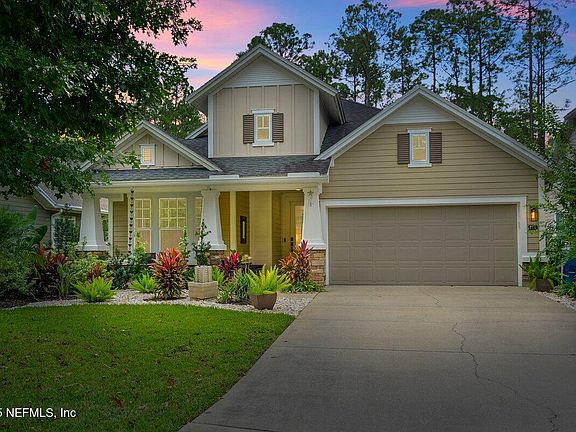 Nestled on a private, wooded cul-de-sac in The Crossing at Twenty Mile, this beautifully appointed 3BR, 3BA home offers elevated comfort + sophistication. Open floor plan features soaring ceilings, fireplaced living room, crown molding and tile flooring throughout (no carpet!) open flex room flooded w/natural light! Enjoy two primary suites: Main primary features a cathedral ceiling and spacious his/hers closets. The second is perfect for multi-gen living or family members craving private space. Additional ensuite bedroom offers space for guests. Dining room includes built-in cabinetry w/lighting, perfect for entertaining and storage. Step outside to a serene screened lanai complete w/outdoor kitchen, ice maker, and fire pit—your own private retreat surrounded by nature. Experience the unmatched lifestyle and resort-style amenities of Nocatee, including pools, trails, parks, fitness centers, and golf cart paths—all just minutes from the beaches and top-rated St. Johns County schools
