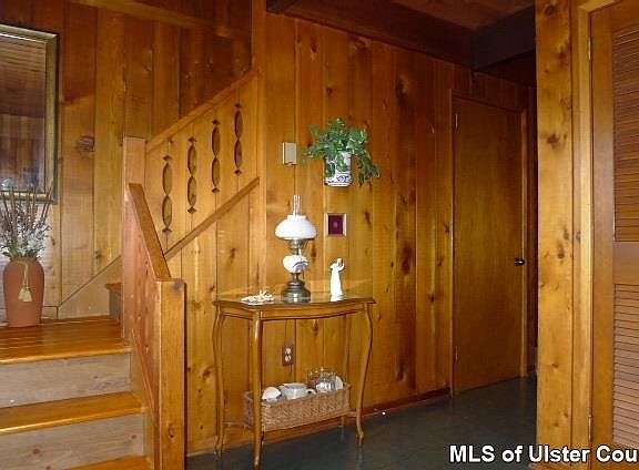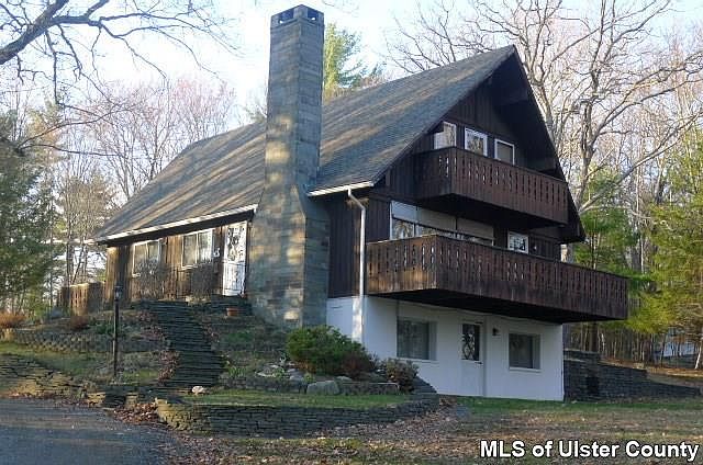 Privately sited chalet-style contempo on much desired Buck Road mixes the best of mid-century and rustic aesthetics. The open floor plan works well for today's way of living and entertaining, and the multiple decks - including one off the master bedroom - provide access to the beautiful outdoors with stone walls, old growth trees and mature plantings. Most rooms are paneled in tongue-and-groove pine and there are two fireplaces - one in the living room and one in the basement family room with a woodstove insert. Second floor bedrooms have vaulted ceilings and lots of storage in closets and under the eaves. The walk-out basement also features a workshop and access to the two-car garage. This lovely home is about a four minute drive from the center of Stone Ridge yet feels miles away from it all.