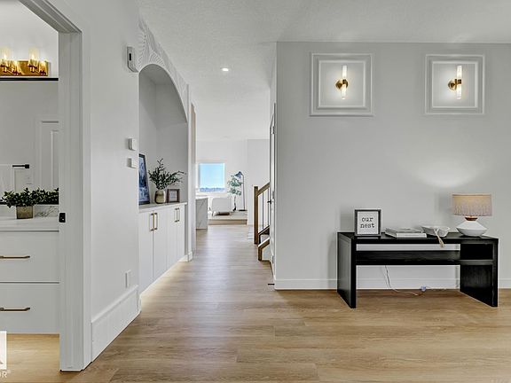 Brand new home backing onto pond & green space! Offering nearly 2500 sq ft above grade, this 4 bedroom, 4 bathroom property is filled with upgrades. The main floor features a spacious foyer, bedroom with full bath, open kitchen with secondary spice kitchen, dining area, and bright living room with floor-to-ceiling fireplace. Upgrades include a waterfall island, marble counters/backsplash & designer lighting. Upstairs offers a bonus room, laundry, and 3 bedrooms including the primary with vaulted ceiling, walk-in closet & luxury 4-pc ensuite. The basement has a side entrance and partial walkout—perfect for income potential, multi-gen living, or extra space. Oversized 500 sq ft garage is painted, drained & ready for heat. Situated on a 30 pocket lot with glass-railed deck, landscaped yard & stunning pond views. Close to schools, trails & parks.