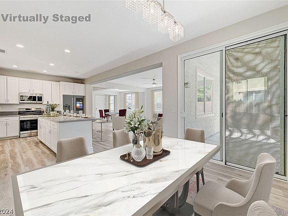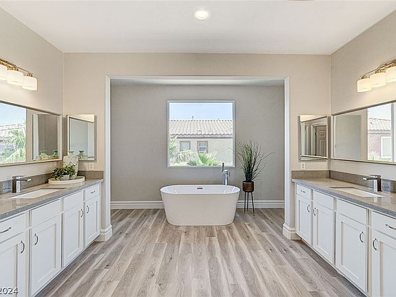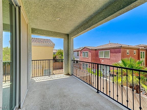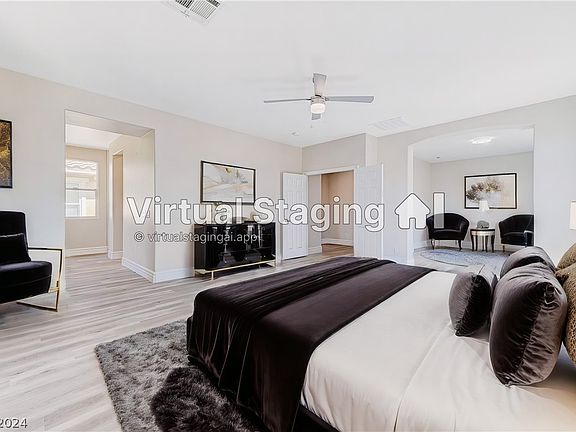 If you like "big" this is BIG! Great room with a big kitchen and separate dining area. Open floorplan makes this a great home for entertaining guests. You have a downstairs bedroom with a full bath too. The primary bedroom is separate from the rest and it's located on the 2nd floor with a balcony overlooking the backyard. The primary bedroom also has a sitting room that could be an office or nursery. Primary bath has a new tub, a sink on either side of the bathroom, shower, and a big walk-in closet. Convenient laundry room upstairs. All new flooring and paint throughout the home. The backyard is a clean slate for your creativity. Easy access to the back gate of Rhodes Ranch. And, the clubhouse is getting remodeled! You'll love the pool, fitness center and tennis courts. Guard-gated community with quick access to the Durango Station casino and all of the new development going on in the Southwest.