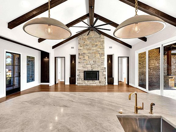 Stone clad fireplaceSunlight fills the homeInviting open planGourmet kitchen