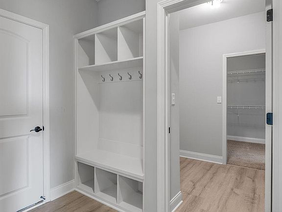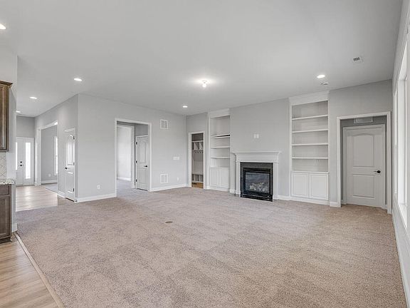 The Marshall plan features a spacious ranch layout with three bedrooms and two baths. Highlights include a flex room, a large family room with built-in bookcases and fireplace, and a kitchen with a large island, farmhouse sink, counter seating, breakfast area, and pantry. A covered patio offers privacy, sheltered by the breakfast area and primary bedroom. The primary suite boasts a trey ceiling, luxury bath with garden tub, separate shower, double vanity, linen closet, and walk-in closet. The utility room with folding area is accessible from both the family room and primary bath. This beautiful home backs to a tree line. Lot 55UC