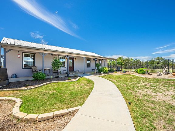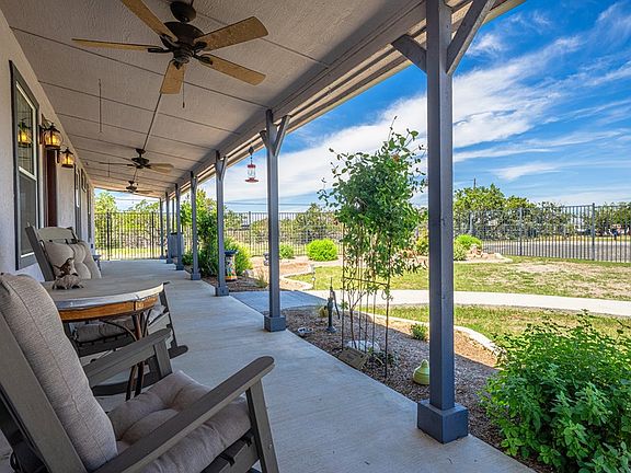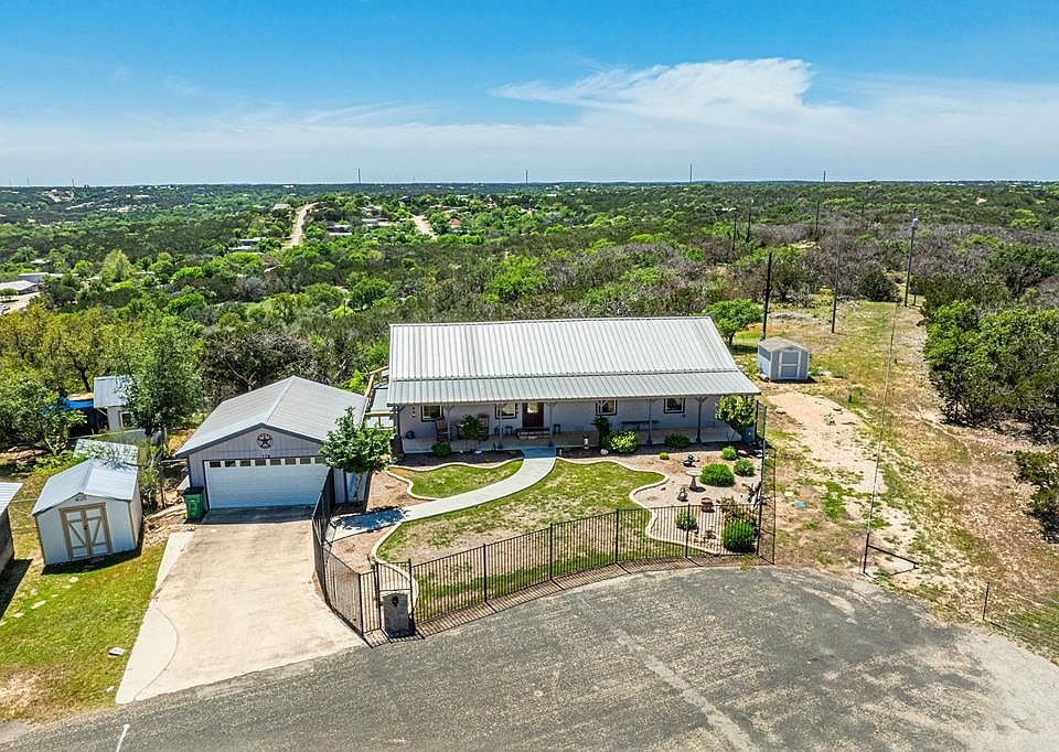 This impeccably maintained home exudes a sense of freshness, boasting a stunning view and freedom from city taxes! Upon arrival, you're greeted by a charming wrought iron fence, landscaped front yard, and a pathway leading to a covered porch spanning the entire length of the house. Inside, discover elegant wood floors, seamlessly connecting the living room, kitchen, and dining area in an inviting open layout flooded with natural light. The kitchen impresses with ample cabinetry, granite countertops, stainless appliances w/ gas cooktop, complemented by a convenient side door leading to a wraparound porch and garden, as well as a detached two-car garage. Adjacent to the dining area is a spacious walkthrough laundry room featuring a sink and additional storage, with access to the back porch. Step outside and be captivated by breathtaking canyon views from the terraced backyard, left open to nature. Down the hall, find two generously sized guest bedrooms and a large bath. The master suite boasts spaciousness, complete with a walk-in closet and a sizable walk-in shower. This home is poised for immediate occupancy – just pack your bags and relish in the beauty of the Texas Hill Country!