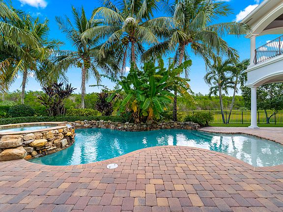Welcome home to this exquisite 5-bedroom, 5-bath luxury estate located in the prestigious gated waterfront community of Ravello. Designed with timeless elegance and exceptional craftsmanship, this home offers both grandeur and comfort across every detail. From the large 24'' x 24'' porcelain tile throughout the main living areas, to the vaulted tray and coffered ceilings - every detail of this home is built to impress. The expansive main-level owner's suite provides an oversized private bath with dual spacious California custom walk-in closets. All four of the additional bedrooms feature private access to an en-suite bath for ultimate convenience. The main floor also consists of a designated office space with built-in cabinets and tray ceilings, a formal dining room, a grand foyer, a true chef's kitchencomplete with a breakfast bar, high-end appliances, and an inviting family and media room along with a second well-appointed bedroom and en-suite bath. Plus many large closets throughout the home, offering excellent storage space. Upstairs features two oversized bedrooms with a Jack-n-Jill bathroom and a wrap-around covered balcony plus an additional bedroom and en-suite. This residence includes modern standards of efficiency and style, with all impact windows, plantation shutters, whole home automatic generator, along with recent improvements like the replacement of two AC units & air handlers, installation of UV lights on all three AC systems, freshly repainted exterior with updated colors, new lighting fixtures, a new 5-burner gas cooktop, refrigerator, and ceiling fan in the family room. The private backyard oasis features a covered outdoor kitchen, resort-style, wifi enabled pool and spa with cascading waterfall, and abundant lounge areas perfect for entertaining. Located within the secluded Island of Ravello community, residents enjoy security, serenity, with proximity to fine dining, shopping, and boating. No mandatory golf or social memberships required.