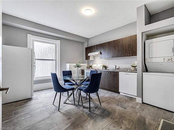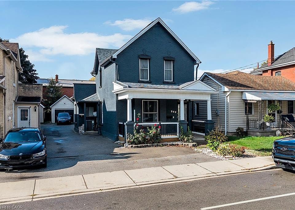 Stunning Home with a fully legal accessory dwelling unit, approved by the City of Brantford. Located in Brantford's Victorian District, this is the perfect fit for first-time homebuyers looking for a reliable mortgage helper. This charming duplex offers a spacious 3 bed, 1.5 bath main residence and a legal, self contained 1 bed, 1 bath rear unit. The main residence features 10' ceilings, Porcelain tiles, new powder room (Oct 2025), main floor laundry, kitchen, living and dining . Upstairs offers 3 spacious bedrooms, and a 4-pc bath. The rear unit is a bright, oversized flat with separate laundry, covered patio and gardens for perfect relaxation. Enjoy a right-of-way driveway, detached garage, and a fully fenced yard . This home is designed for flexible living and financial freedom. The entire building boasts a brand new roof (September 2025), ensuring lower maintenance living and peace of mind: professionally done exterior painting, resulting in a fresh and modern finish. Don't miss this smart, move-in ready investment in your future.