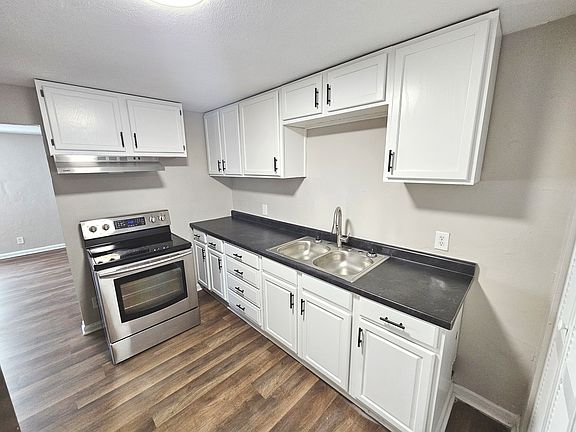 Matte black hardwareModern white kitchen cabinetsLaundry hookup on siteStainless steel appliancesNew black countersLvp flooring