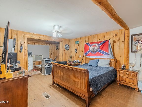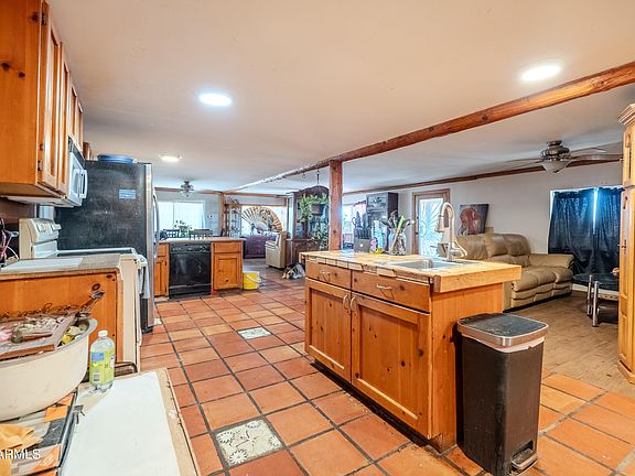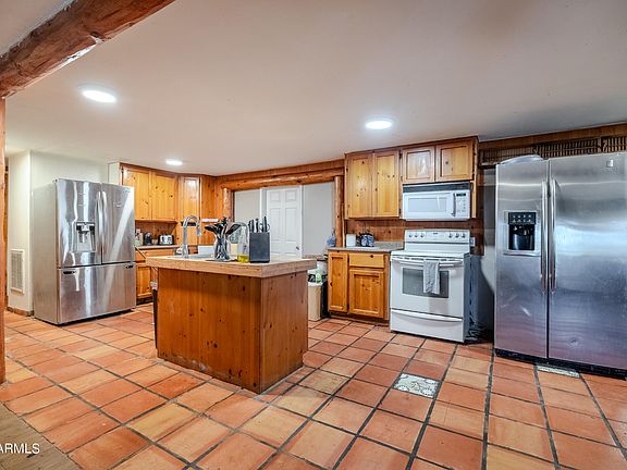 Nestled on 1.47 acres, this charming horse property offers a perfect blend of rustic elegance and modern convenience. With no HOA, it features horse stables, a tack room, and a chicken coop, making it ideal for animal lovers. The property also includes a hauled water tank and owned solar. Inside, the spacious 4-bedroom, 2-bathroom home boasts Saltillo tile and wood flooring throughout. The master suite offers a private bathroom with a sunken tub, shower, and a walk-in closet. The large open kitchen, complete with an eat-up counter, flows into the dining, family, and living rooms, creating a warm and inviting atmosphere. Covered patios provide additional outdoor living space, perfect for enjoying the serene surroundings. Close proximity to hiking and trails for outdoor enthusiasts.