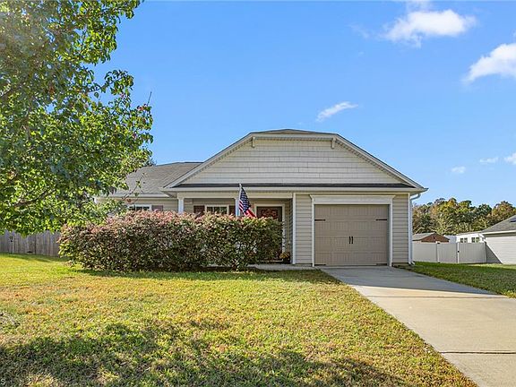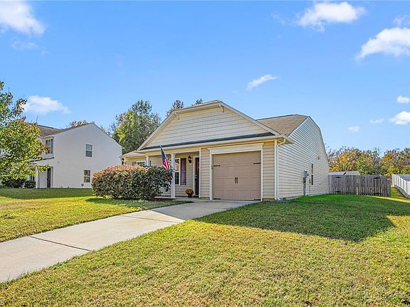Welcome home to this charming one-level home featuring a classic rocking chair front porch and single-car garage! Built in 2015, this home offers an inviting open floor plan with a spacious living room that flows seamlessly into the dining area and kitchen, complete with ample cabinetry and counter space. All kitchen appliances remain! The primary suite features a private bath with a dual vanity, shower/tub combo, and walk-in closet, while two additional bedrooms provide flexibility for guests, family, or a home office. Carpets have been freshly cleaned throughout! The fenced backyard offers plenty of space and privacy to relax and unwind. HVAC replaced in 2024! Conveniently located near shopping, dining, and major highways—don’t miss your chance to make this home yours!