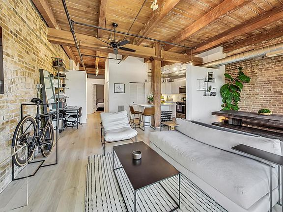 Welcome to Buck City Lofts! Large, beautifully updated 1 bed/1 bath condo perfectly situated just steps from the 606 Trail! This sun-drenched condo features exposed brick, soaring timber ceilings, massive windows, and a large private balcony with east-facing views. Newer high end flooring throughout, and a fully updated kitchen with large kitchen island, white calacatta countertops, and stainless steel appliances, that opens into a wonderfully sized living and dining space. Bedroom can accommodate a king sized bed, and includes a huge walk in closet. Other features include in-unit laundry, coat closet, utility closet, and linen closet in the bathroom. The building features common rooftop deck with stunning 360 degree views, bike storage, shared storage, high-speed Google fiber internet, convenient Butterfly entry system, and an attached garage. Located conveniently the heart of Bucktown and walking distance to the Western Blue Line, local retail, restaurants, nightlife and endless entertainment options. 1 covered garage parking spot included in the price.