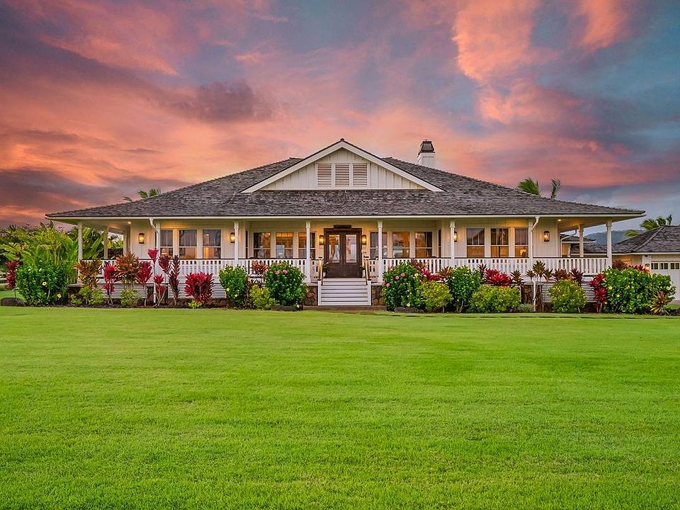 This architecturally-designed, single-story home offers a stunning presentation of exceptional craftsmanship, accentuated with charming plantation-era design elements of Hawaii's past. The gracious front lanai welcomes guests into the vast great room featuring soaring 20 ft. ceilings, multiple seating areas, and an abundance of natural light. Situated on nearly 2.5 acres of land, the property boasts mountain and ocean horizon views from every direction and is perfectly positioned to capture the prevailing trade winds. Cozy up by the fire, dine on the back covered lanai, or enjoy a dip in the hot tub while taking in the sunset.