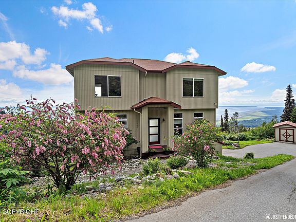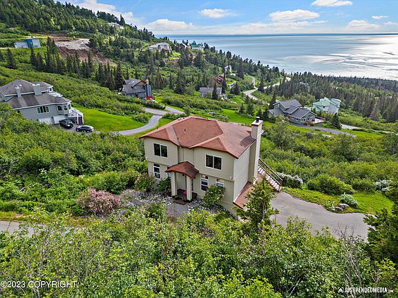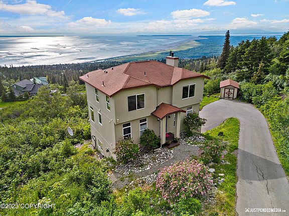 This contemporary three-story offers breathtaking views of Cook Inlet, Redoubt, & Mt. Susitna with a western exposure deck that soaks up the sun. Step inside to discover an updated interior with laminate floors throughout and a designer kitchen with walnut cabinets & sleek gray quartz countertops, plus a charming barn door off the powder room, adding a touch of rustic charm to the overall design.The main living space has two sitting areas, a wood-burning fireplace, and large picture windows across the front. Then, as you ascend to the top floor, you'll be greeted by three spacious bedrooms, including the primary with private en suite that has been recently remodeled to include a step-in tile shower and a luxurious soaking tub with its own awe-inspiring view. The home is energy-efficient with a 5-Star Plus energy rating so if you're looking for a home that seamlessly blends contemporary comfort with nature's most stunning views, this is the one for you.