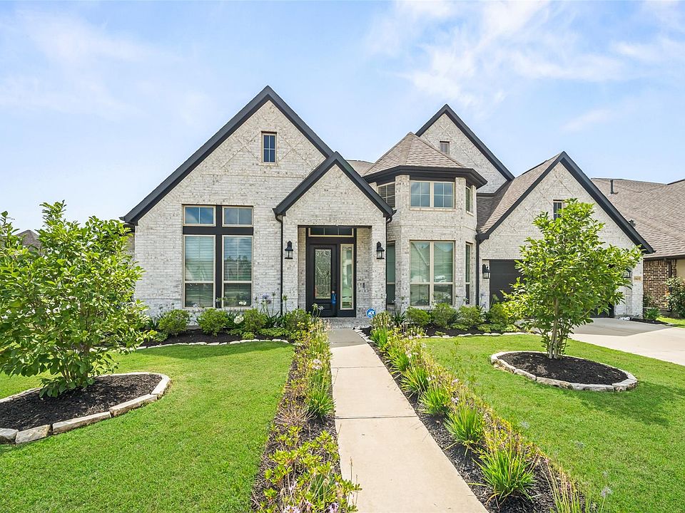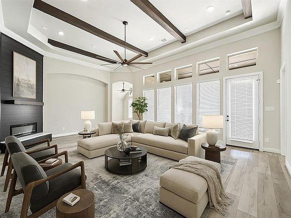 This stunning home blends timeless elegance with modern refinement. A graceful brick exterior and arched architectural lines set an impressive tone from the moment you arrive. The chef’s kitchen is a standout, offering rich cabinetry, granite countertops, a gas cooktop, and an oversized island—ideal for entertaining. The open-concept living area features a dramatic beamed ceilings & a contemporary fireplace. Retreat to the luxurious primary suite, where a sliding barn door leads to a spa-style bath with dual vanities, freestanding tub, frameless glass shower and chandelier. Secondary bedrooms are generously sized with walk-in closets. A mudroom, stylish fixtures, & formal dining space elevate everyday living. Dual function lighting includes a nightlight setting, creating a soft, ambient atmosphere. Step outside to a large covered patio with a built-in summer kitchen overlooking a spacious backyard, or enjoy the many communities amenities including gym, 5 acre lake, cafe & paddle boats