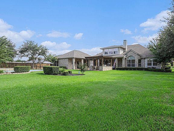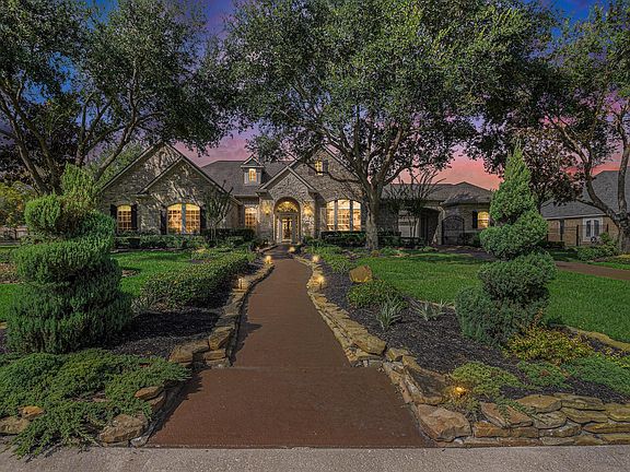 Impeccably landscaped former David Weekley model in Lakes of Fairhaven, set on nearly an acre with serene lake and fountain views. This stunning home features a private saltwater pool, spa, outdoor kitchen, large covered patio, and a guest suite with full bath, kitchenette, and private entrance. A gated driveway leads to a 3-car garage. Inside, enjoy an open-concept layout with travertine floors, island kitchen with stainless steel appliances, double ovens, and ample workspace. The luxurious primary suite has backyard access, a jetted tub, separate shower, and large closets. All downstairs bedrooms have en suite baths and connect to a flex space with built-ins. Upstairs offers a game room with wet bar, accessed via main or spiral staircase leading to a cozy art nook. Fresh paint and carpet throughout. A richly appointed study and elegant dining room flank the grand foyer. This one-of-a-kind home blends luxury, comfort, and functionality.