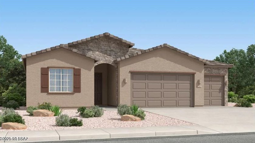 This spacious single-story home features a3-bay garage, ideal for car enthusiasts, extra storage, and a modern design. The open layout among the kitchen, Family Room and dining room leads to a covered patio for outdoor living, while a nearby office is great for at-home work. All three bedrooms surround the space, including the luxe owner's suite with a walk-in closet. This home includes upgraded countertops and cabinetry throughout, as well as a Luxury Tile Flooring Package. Also includes Rinnai Tankless Water Heaters, Smart Thermostats, Post-Tension Foundation, Radiant barrier roof decking, 2'' Faux Wood Blinds and more!