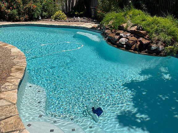 Surrounded by majestic, mature trees, the property offers a peaceful, picturesque setting. The centerpiece of the outdoor space is an inviting private in-ground pool, complete with a tranquil waterfall, perfect for relaxation and entertaining.