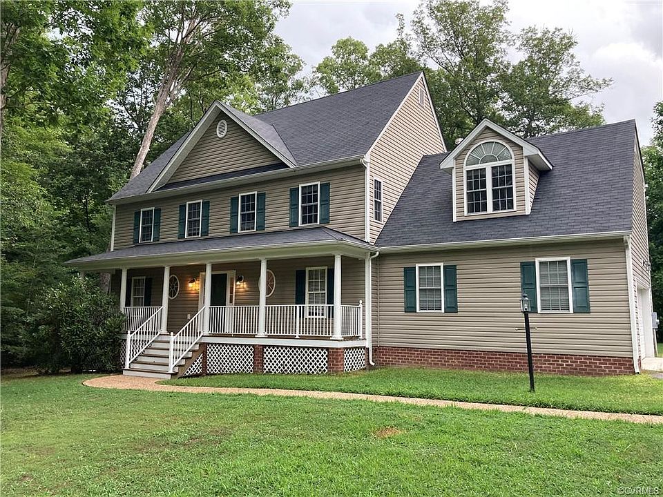 Gorgeous full porch colonial on 1.6 acres with maintenance free vinyl exterior with large rear deck. New interior paint and carpet. Kitchen with granite countertops, 2 x 3 island with granite, back-lit upper cabinets. Family room with Gas fireplace . Luxurious master suite with 3-sided gas fireplace, sitting area, double dormer window & hugh walk-in closet. Master bath with jacuzzi tub and separate door and double vanity. 4th bedroom is on 3rd floor & is unfinished. (sq ft with that bedroom is 2,715 sq ft) Side entry garage with pedestrian door and paved driveway. Walk to school situated at front of neighborhood.