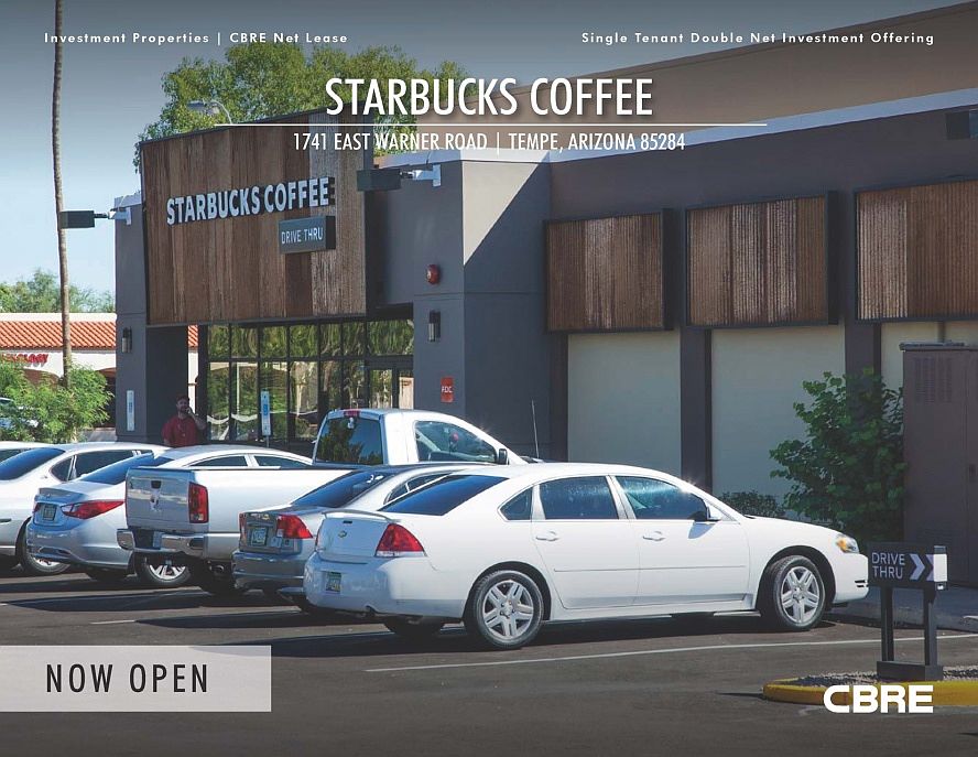 Starbucks For Sale Tempe AZ - Starbucks for sale in a very dense infill location in Tempe. Starbucks sits as a pad to a newly remodeled Bashas anchored shopping center called Cobblestone Village. Starbucks is also adjacent to a Wells Fargo bank pad. Brand new 2014 constructed Starbucks opened for business as of September of 2014. The building is approximately 2,720 rentable square feet on approximately 32,452 square feet of land. This is a brand new 10 year lease with Starbucks. This Starbucks investment offers a corporate guarantee by Starbucks Corporation. Starbucks has an investment grade credit rating of A-. Starbucks has approximately 21,000 locations in over 65 countries worldwide. Tempe is centralized within the Phoenix metropolitan area and real estate values are enhanced due to lack of nearby land available for development. Tempe is home to the new State Farm Insurance campus that will bring 10,000 total jobs to the market by 2017. Tempe is also home to Arizona State University, with an estimated 76,000 students and 11,185 employees. The Property is strategically located in a densely populated area that is home to approximately 111,585 residents in a three mile radius and 304,949 residents within a five mile radius. This Starbucks For Sale Tempe AZ has an average household income in a one mile radius of $109,905. There is also a large employment center with approximately 91,066 jobs within a three mile radius and 227,480 jobs within a five mile radius (SOURCE: Nielsen). The ASU research park (1 mile east) is one of the most highly improved office parks in the Phoenix area. Employers in the park include: Air Products, ASU Macro Technology, Avnet Technology, Edward Jones, Go Daddy, Infocrossing, Transamerica Research Center, US Foods, ViaSat, Walgreens and more. The traffic counts on Warner Road are estimated at 25,922 vehicles per day. The traffic counts at the intersection are estimated to total 46,624 vehicles per day (SOURCE: Costar). This Starbucks is located only 1 mile west of the 101 freeway and 3 miles east of the I-10 freeway. Investment Highlights Dense infill Tempe investment opportunity Starbucks corporate guarantee Brand new 2014 construction and 10 year lease Very high average household income in a one mile radius of $109,905 Major employment in the submarket; 91,066 jobs in a three mile radius Over 46,624 vehicles per day at the intersection Starbucks is publicly traded (Nasdaq Symbol: SBUX) with a S&P A- investment grade credit rating Starbucks has approximately 21,000 locations with 182,000 employees Starbucks For Sale Tempe AZ