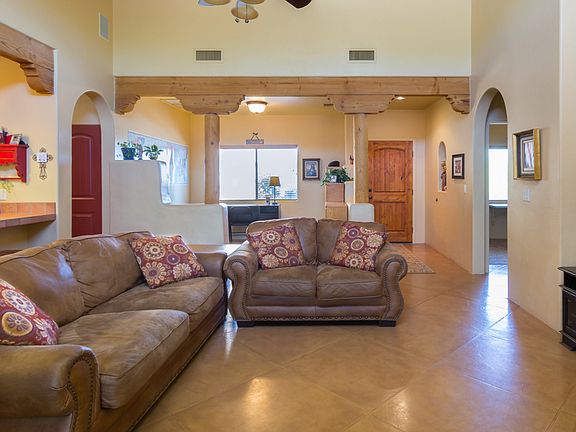 Custom built Santa Fe featuring clerestory windows - wood beams - and scored concrete floors. Bedrooms are carpet. Open floorplan. Kitchen has tiled countertops and stainless appliances. Formal Dining Room PLUS den. Master bedroom is large and has huge walk-closet. Master bathroom is custom and has walk-in shower. Front bedroom could easily be an office. Split bedroom plan. Very large laundry room with custom built in laundry bins. Oversized garage with plenty of storage space. Covered patio in back yard plus a separate dog area PLUS a garden area. This home sits back off street and has long driveway. Easy access to I-10. Call today for an appt.