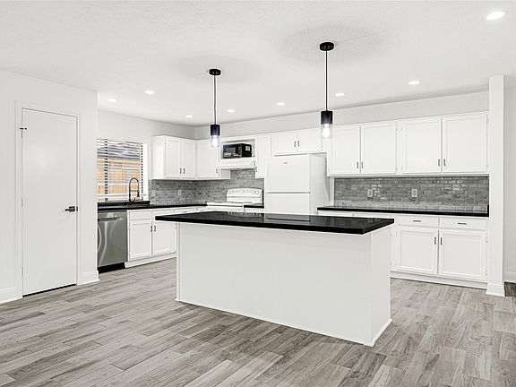 White brick fireplaceTwo-car garageRecessed lightingStainless steel appliancesWood-look tile flooringBlack granite countertopsCovered patio