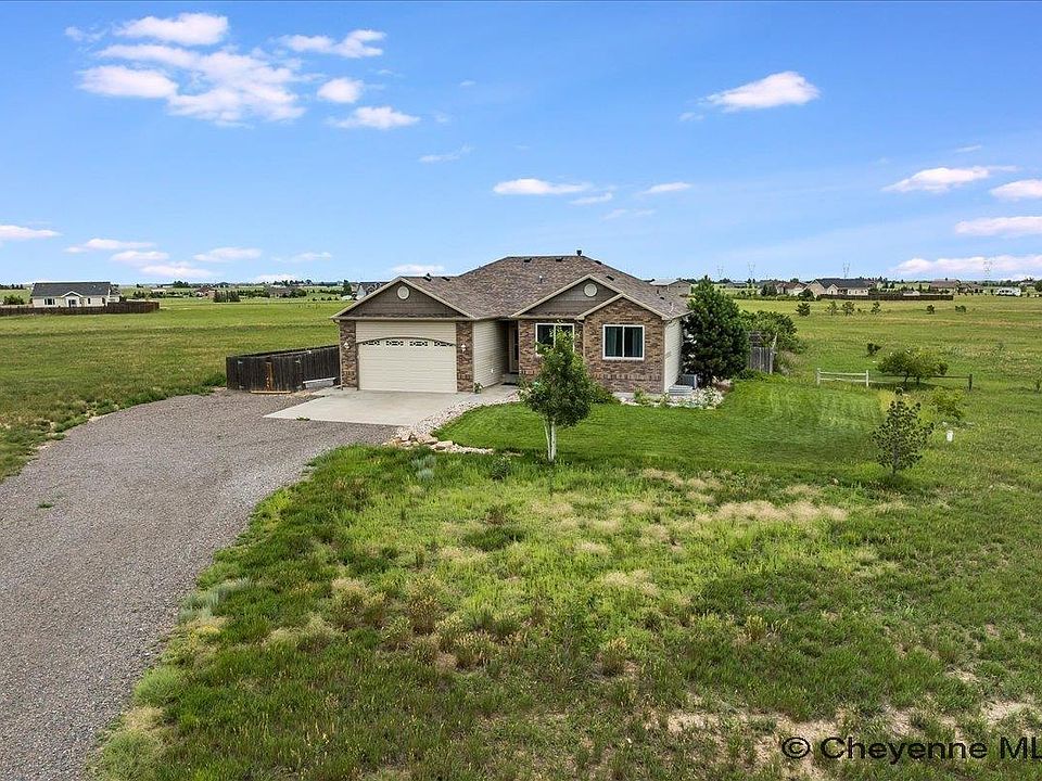 Impeccable Rural Home in Cardinal Estates! Nestled in a rural subdivision just east of town, this Wyoming haven blends serene country vibes with everyday ease. Stunning refinished hardwood flows through entry, hall, kitchen, and dining. Expansive living room boasts vaulted ceilings, a cozy gas fireplace, and abundant natural light from oversized windows. Lavish primary suite features a walk-in closet, tray ceiling, and luxe 5-piece bath. Finished basement shines with a massive rec- room and three generous bedrooms. Ample oversized closets handle all your storage. Stay cozy year-round via forced-air heat and central AC. Fenced backyard includes a 12x16 shed; front and back yards flaunt sod and sprinklers. Brick-and-vinyl exterior promises low-maintenance appeal. Pride of ownership radiates throughout this pristine retreat!