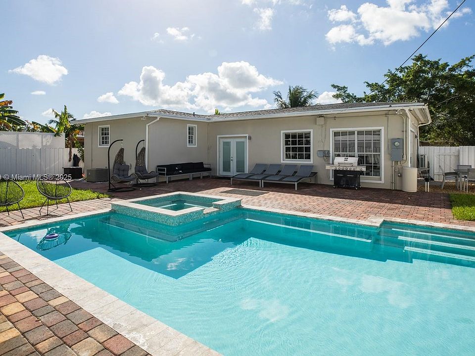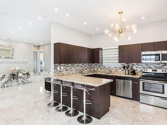 Home Sweet Home! Beautifully updated 4-bed, 2-bath pool home on a 7,500 sq ft lot. Inside, enjoy sleek marble floors, custom lighting, and a gourmet kitchen with black wood cabinets, granite counters, and stainless steel appliances. Both bathrooms feature modern vanities and marble showers. Step outside to a newer pool and Jacuzzi—perfect for entertaining or relaxing nights under the stars. Impact windows throughout provide security and peace. This home blends comfort, style, and upgrades in every detail!