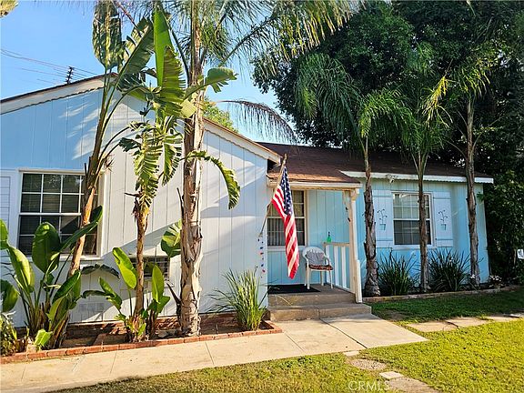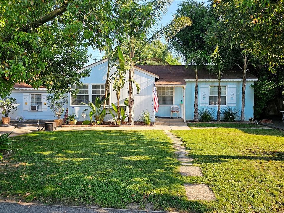 This house has loads of charm and character inside and out - they don't make them like this anymore! The floor plan just makes sense, and with the potential ADU created from the converted garage, you can have additional potential income, or you can convert it back to an attached 2-car garage with direct access into the house through the laundry room and kitchen. And for the first time in decades this house is awaiting a new owner to call it home, or the perfect investment property. The moment you step onto the property, you'll notice a well-maintained, spacious front lawn and a circular-shaped driveway, plus one on each side, so, if you happen to have many guests, you can park many cars! Mature trees, including a lemon tree, provide a welcome shade to the home, front and back yards. The welcoming front porch beckons you to step inside. The oversized living room has a large wall air conditioner to keep the main house cool, and three large windows, so it's light and bright. Adjoining dining room has another window and a seascape wallpaper mural, so you might think you're dining in a cozy restaurant by the sea! The hallway leads to the kitchen, bathroom and two bedrooms. The kitchen is large and has a glass-door pantry. The adjoining laundry room has a back door leading into the backyard. The bedrooms are on the other end of the house and they are both good size, one facing the front and one the backyard. The converted garage is a studio apartment with a galley kitchen (no stove but does have a sink and a refrigerator), breakfast bar, a bathroom with a shower, a walk-in closet, a large living area with a good size window, and some nice built-in shelves. A window air conditioner, in addition to the surrounding mature trees, will keep you cool, and a space heater warm in the winter. The converted garage even has its own fully-fenced backyard with a fountain and paver stones. The gated entry into the apartment makes it a completely separate and private living area from the main house. The backyard for the main house has an outdoor covered area currently used as a place to gather for watching the games. This house may need some fixes here and there (sold As Is), but it is absolutely amazing. The location is fantastic, close to schools, shopping, transportation, and has quick access to the 118 and 405 freeways. Heaven on earth! Hurry with your offer before it's gone!