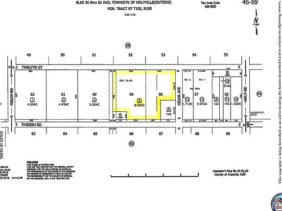 A fantastic opportunity to purchase a large tract of land just outside the boundaries of the City of Holtville. The 8.5 acres that make up the property are now under cultivation and generating revenue. You can build your own home on this parcel, or you can use it as you see fit. With this characteristic, the possibilities are unlimited. To find out the range of possible applications, it is advised to speak with the City of Holtville.