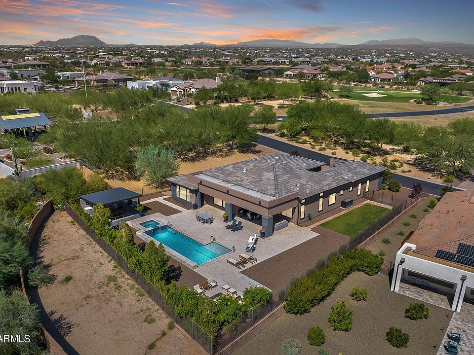 WATCH THE SUNRISE OVER FOUR PEAKS EACH MORNING! This stunning 2021 built Dorado Model with a Guest Casita offers 3480 sq. ft of living space featuring 3 en-suites. 3.5 baths, plus a separate Casita living space with built-in kitchen and sits on 16,800+sf one of the larger lots in the prestigious Trilogy at Verde River. Beautifully designed with luxurious upgrades the Chef's Kitchen showcases upgraded GE Monogram appliances expansive leather-finish granite countertops, custom lighting, decorative tile backsplash and a spacious walk-in pantry. Primary suite is generously sized and offers a walk-in closet, double sinks, custom lighted mirrors and a walk-in shower. The adjacent personal retreat room offers the perfect space for exercise, music, hobby room or relaxation.