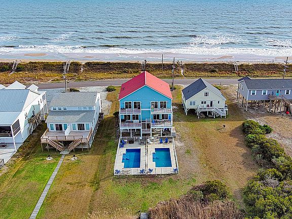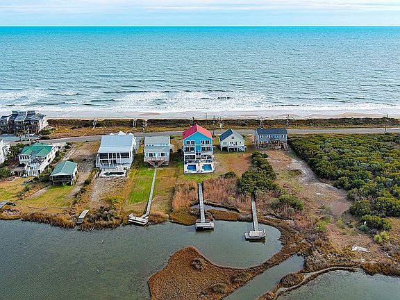 This captivating 4 bedroom/3.5 bath property is truly one-of-a-kind on Topsail Island, with ownership from the ocean to the intracoastal waterway along with your own private, large, saltwater pool on an almost 1 acre lot! There is deeded beach access leading to the sandy shores directly across from the property, which has wide, expansive, unobstructed ocean views from both the lower and upper floors and you have deeded intracoastal waterway access with your own private dock and launch in the rear of the property, with breathtaking water views from both the lower and upper rear floors. Water truly surrounds this property on all sides, with ample decks on both floors of the front and rear of the property.