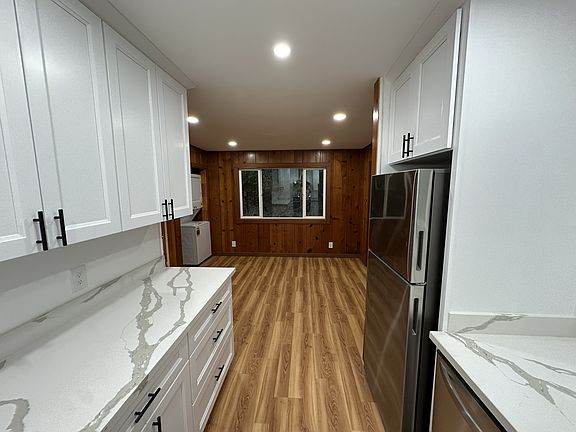 Welcome to this beautifully renovated 2-bedroom, 1-bathroom home featuring brand-new vinyl floors, charming knotty pine wood walls throughout, and elegant quartz countertops with new stainless steel appliances in the kitchen. Enjoy lush green views from every room and a deck that extends from the front door along the back of the house, perfect for relaxing or entertaining.