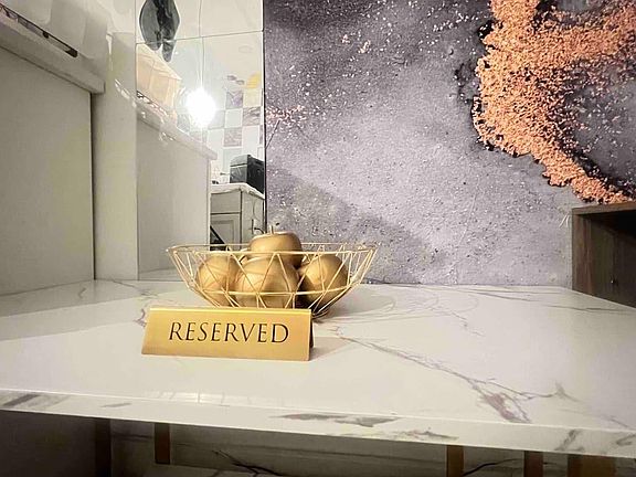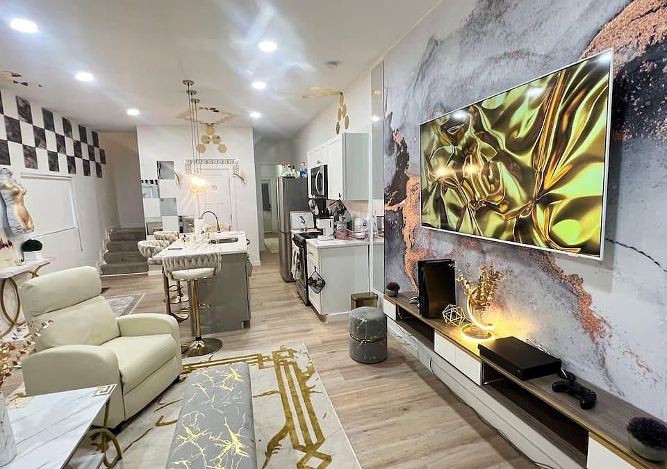 Golden decorDowntown townhouseSleek quartz surfacesMain floor tvBespoke cabinetryImpressive amount of detailUpstairs projector