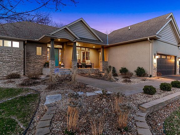 This custom built and meticulously maintained walk-out rambler, only available due to relocation, is nestled in a maturely wooded cul-de-sac with zero through traffic. Designed with entertainment in mind, this sprawling home features spacious common areas, 10-foot ceilings on the main floor, a 4-season sunroom and private nature views in the backyard. Move into this turn-key residence with confidence as nearly all mechanicals and appliances have been recently replaced by the current owners. The main floor living room is open to the grand front entry, formal dining room, partially open to the kitchen and features massive windows with views of the back yard which allow natural light to come flooding into the space. A beautiful 3-sided gas fireplace welcomes you into the hearth room and kitchen area with a breakfast nook. The well-appointed kitchen is bright and open to the cozy hearth room, featuring a granite-topped island, a spacious pantry and newer stainless-steel appliances. Located off the kitchen, the 4-season sunroom boasts floor to ceiling windows with peaceful nature views and stairs from the attached deck provide quick access to the backyard. A second front entry leads directly into the mudroom with plenty of space for people to take off their shoes/coats, and provides access to the garage, a large walk-in closet, the main-floor half bath, kitchen and laundry room. The laundry room boasts a side-by-side washer and dryer set-up with a utility sink/cabinet, a closet and supplemental refrigerator. The generously sized main-floor primary bedroom ensuite has dual closets (1 walk-in and 1 standard) and a full bathroom featuring a jetted tub, walk-in shower, dual vanities and a separate water closet. The entertaining and centrally located lower-level family room, which walks out to the back yard, features an updated media center, gas fireplace, dry bar and a wine cellar. A ¾ bath serves the lower-level common spaces and the 3 spacious kid’s bedrooms. The lower-level exercise room, which can be used as a flex space, has a large walk-in closet, and the sizeable utility/storage room has convenient stairs which connect directly to the garage. In addition to insulating and heating the garage, the current owners improved the curb appeal with a brand-new driveway, new garage doors and refreshed landscaping. The peaceful backyard is maturely wooded and mostly flat with ample space for outdoor activities, and a walking/biking trail with access to Grove West Park is located behind the property to the north. Enjoy quick access with only a 6-minute drive to 494 and a 9-minute drive to all the restaurants and shopping that Maple Grove Crossing has to offer.