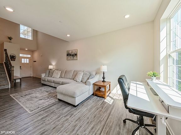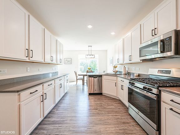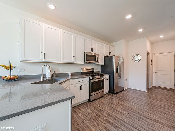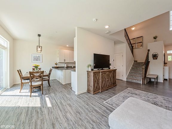 Beautifully maintained and move-in ready, this 3-bedroom, 2.1-bath townhouse is nestled in the highly desirable Prairie Commons. Step inside to a welcoming two-story foyer and a light-filled, open floor plan with 9-foot ceilings. The kitchen features 42-inch white cabinetry, quartz countertops, GE stainless steel appliances, a breakfast bar, and an eat-in area with sliding doors that open to a backyard backing to trees for added privacy. Upstairs, the spacious primary suite offers a walk-in closet and en-suite bath, while two additional bedrooms share a full hall bath. The laundry room is conveniently located on the second floor. Additional highlights include Wi-Fi Certified home featuring wired Wi-Fi amplifiers, Ring doorbell, smart lock, Wi-Fi thermostat, Wi-Fi enabled garage door opener, and more. Located near shopping, dining, recreation, I-88, bike path, park, open green space, and a scenic pond. This townhouse offers comfortable and convenient living.