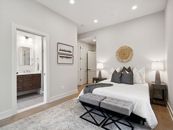 Relax in a serene retreat featuring a plush queen bed, modern decor, and ample closet space. The room includes direct access to a stylish en-suite bathroom with a walk-in shower and sleek finishes, making it both comfortable and convenient.