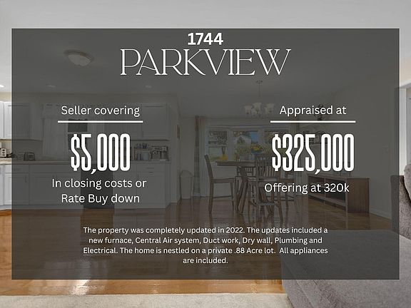 Amazing home located in the Parkview neighborhood just off 16th street. Seller is now offering to cover up to $5000 in buyers closing costs. The property was completely updated in 2022. The updates included a new furnace, Central Air system, Duct work, Dry wall, Plumbing and Electrical. The home is nestled on a private .88 Acre lot. All appliances are included.
