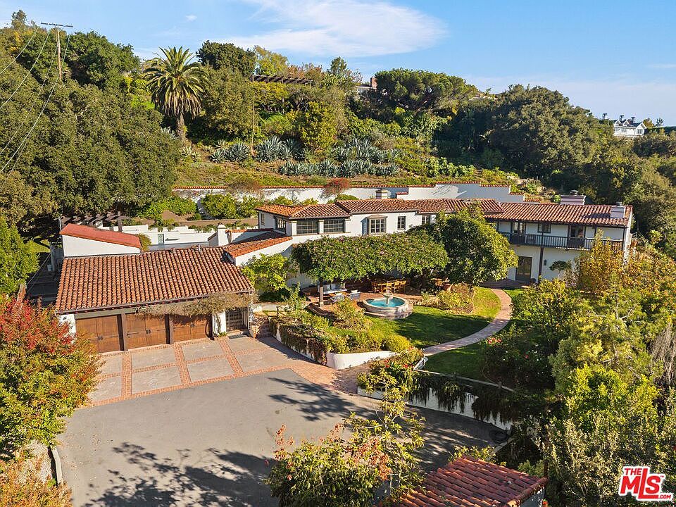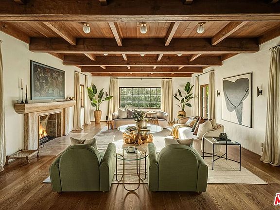 Nestled at the end of a long gated drive in Lower Mandeville Canyon, La Casa De Flores is a Spanish Revival estate of rare provenance and timeless beauty. Designed in 1929 by acclaimed architect John Byers and thoughtfully reimagined for modern living, the home sits on nearly an acre of lush, secluded grounds, offering an atmosphere that feels both grand and deeply inviting. Inside, the craftsmanship of the original era remains intact -- with wood-beamed and coffered ceilings, rich hardwood floors, graceful French doors, and hand-crafted casement windows. Sculptural designer lighting fixtures punctuate the interiors, enhancing the interplay of light and texture throughout. The formal living room, framed by garden views, is anchored by a stone fireplace and crowned by thick, solid wood beams. The formal dining room opens to verandas on both sides, creating effortless flow for gatherings, while the warm, inviting family room is wrapped in custom built-ins. The fully remodeled gourmet kitchen blends elegance and function with stone countertops, custom cabinetry, and an expansive dual-surface marble and butcher block island. A Lacanche range sits within a bespoke alcove, complemented by a walk-in pantry. Adjacent, the glass-topped atrium breakfast room dazzles with direct access to the outdoor kitchen and al fresco dining patio outfitted in vibrant Spanish tile and an original fountain. The primary wing offers a serene retreat with a private covered balcony, far-reaching canyon vistas, a corner fireplace, and a designer walk-in dressing room. Its en suite bath, bathed in natural light, features dual marble vanities and a custom-tiled shower. Four additional guest suites, including two joined by a Jack-and-Jill bath, provide comfort and flexibility. A detached office with a tranquil handpainted mural and expansive windows offers an inspiring workspace, while a coved wine cellar adds an indulgent touch. The grounds are a true sanctuary -- mature fruit trees, flowering gardens, peaceful fountains, and sweeping lush views frame a 55-foot swimmer's pool, brick patios, and a pergola lounge with firepit. Accessory structures and a three-car garage complete this rare and private compound, just moments from Brentwood's finest restaurants, boutiques, and top-rated schools. Blending architectural pedigree with modern comfort, La Casa De Flores is not merely a home -- it's a priceless work of art in one of Los Angeles' most coveted neighborhoods.